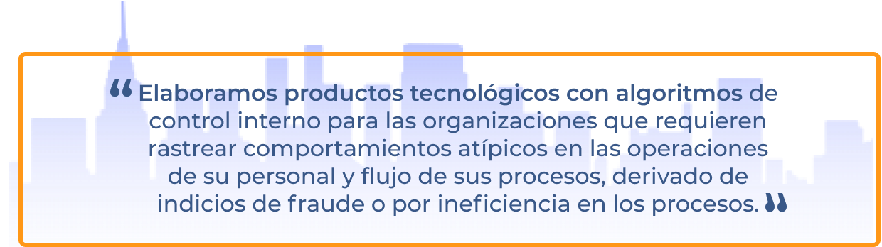 Los algoritmos que se tienen desarrollados alertan de comportamientos atípicos en indicadores que identifican desviaciones operativas o administrativas. Genera información a un corte o en tiempo real a partir de cálculos parametrizables a límites permitidos y es perfecta para advertir de fugas de recursos entre miles de operaciones.